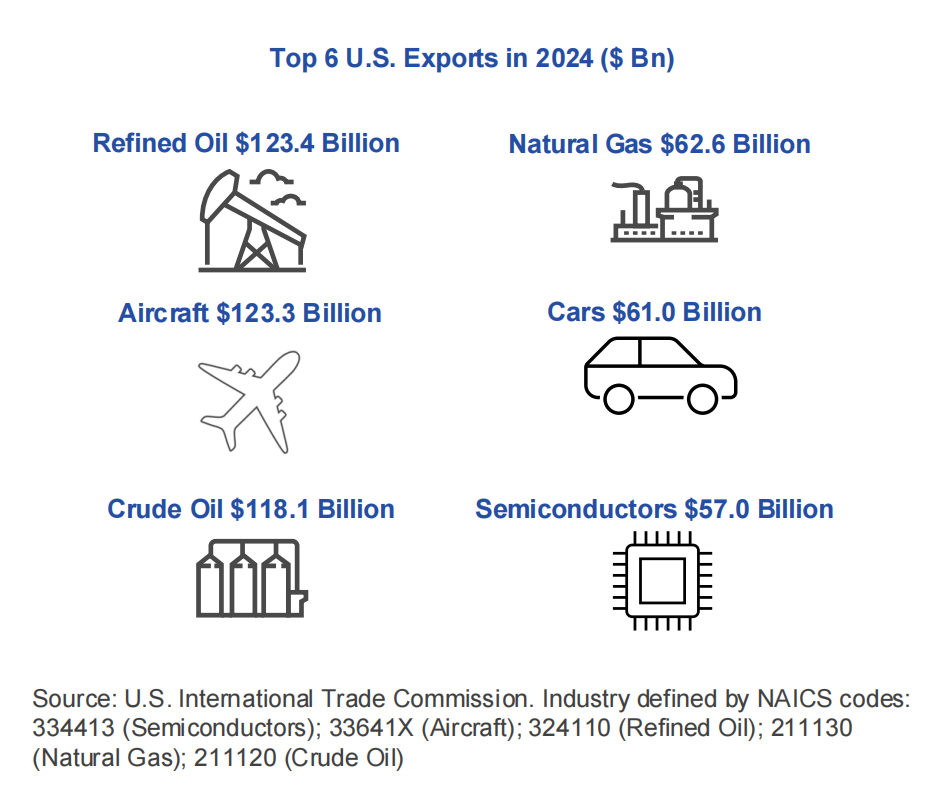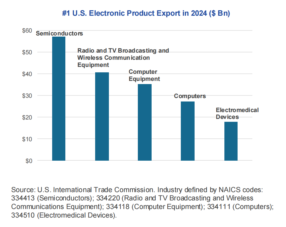 2024 年美国半导体出口额达 570 亿美元,在美国出口产品中排名第六,仅次于精炼石油、飞机、原油、天然气和汽车。半导体在美国所有电子产品出口中占比最大。