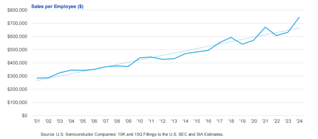 自2001 年以来,美国半导体行业的劳动生产率已提升超一倍。这些生产率的提升得益于持续高水平的资本投入和研发支出。2024 年,美国半导体行业记录的人均销售收入超过 744,312 美元。