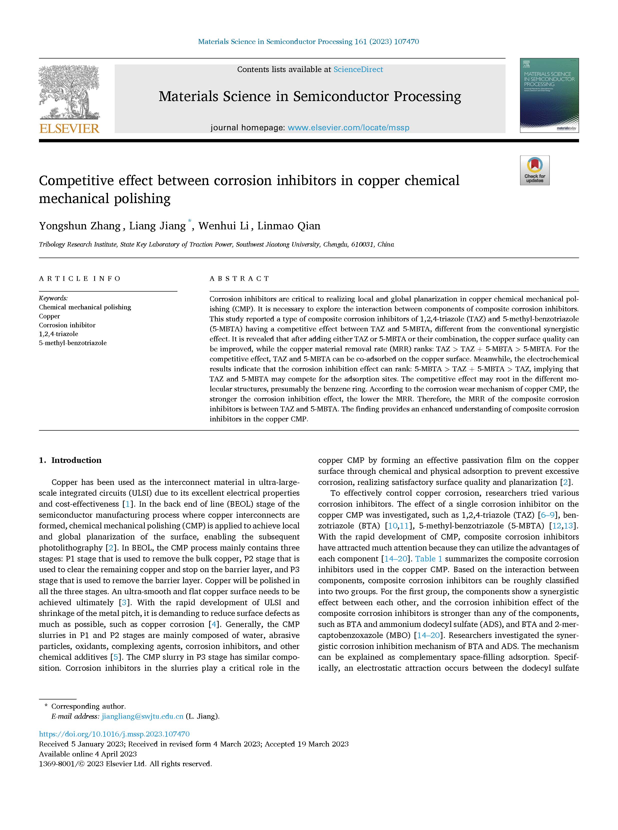 缓蚀剂在铜化学机械 抛光中的竞争效应