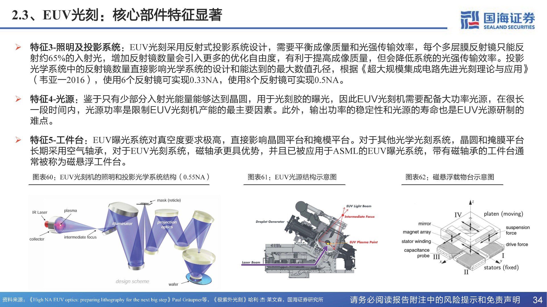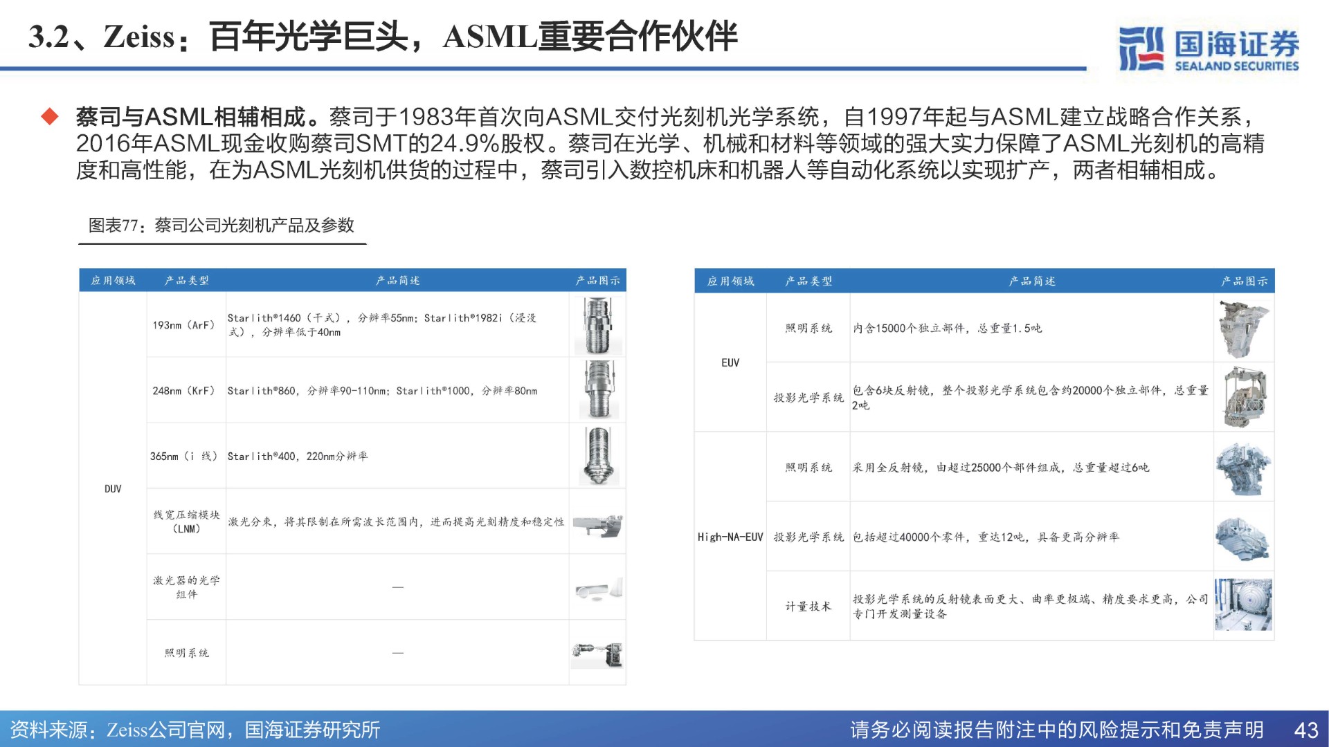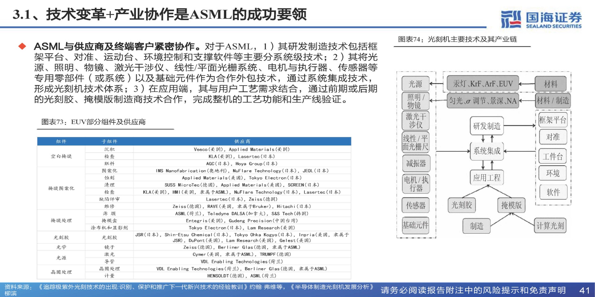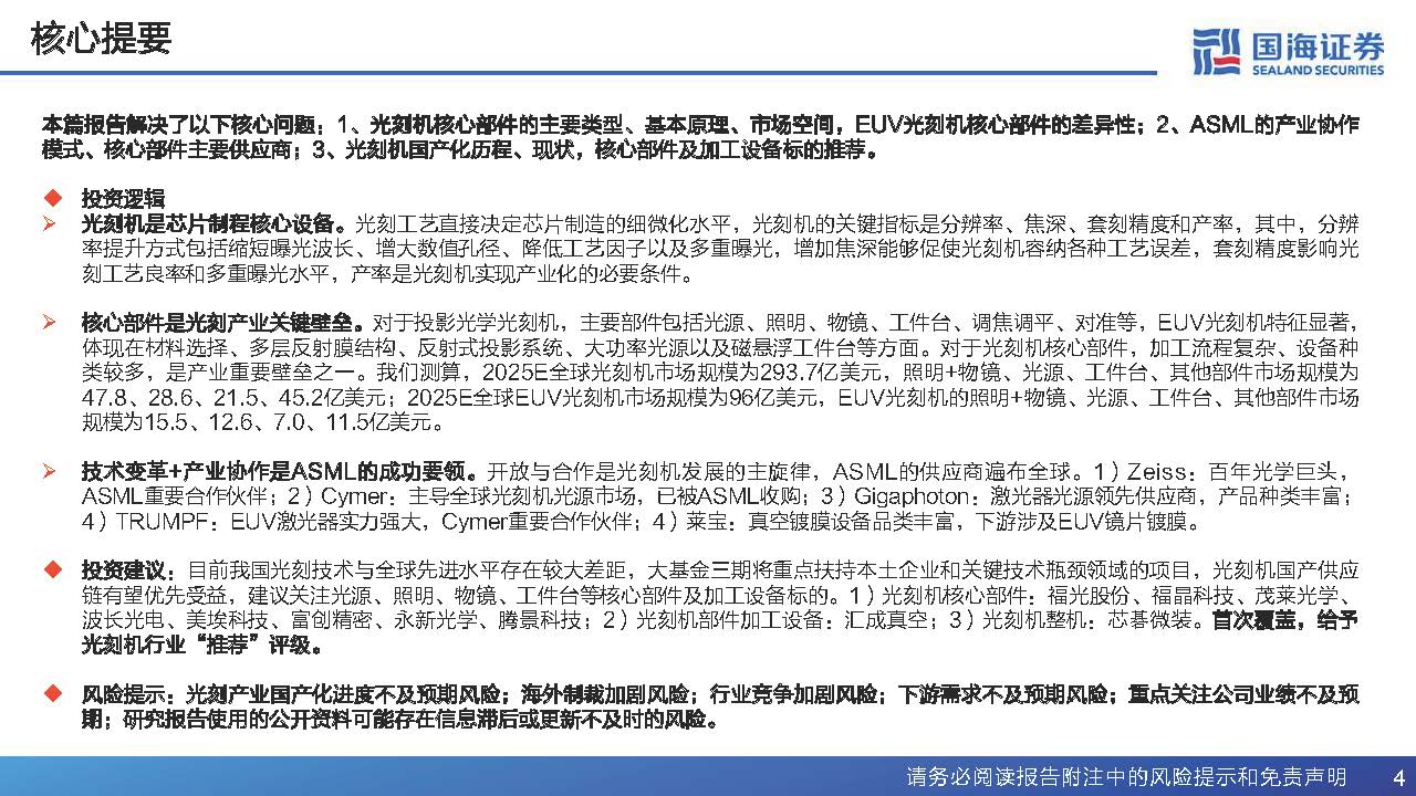 本篇报告解决了以下核心问题:1、光刻机核心部件的主要类型、基本原理、市场空间,EUV光刻机核心部件的差异性;2、ASML的产业协作 模式、核心部件主要供应商;3、光刻机国产化历程、现状,核心部件及加工