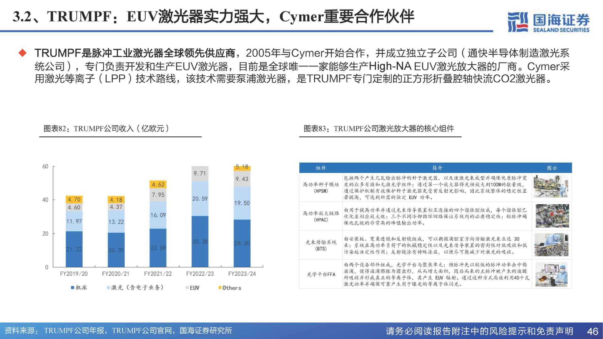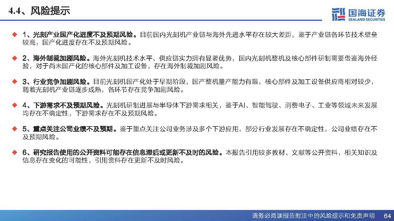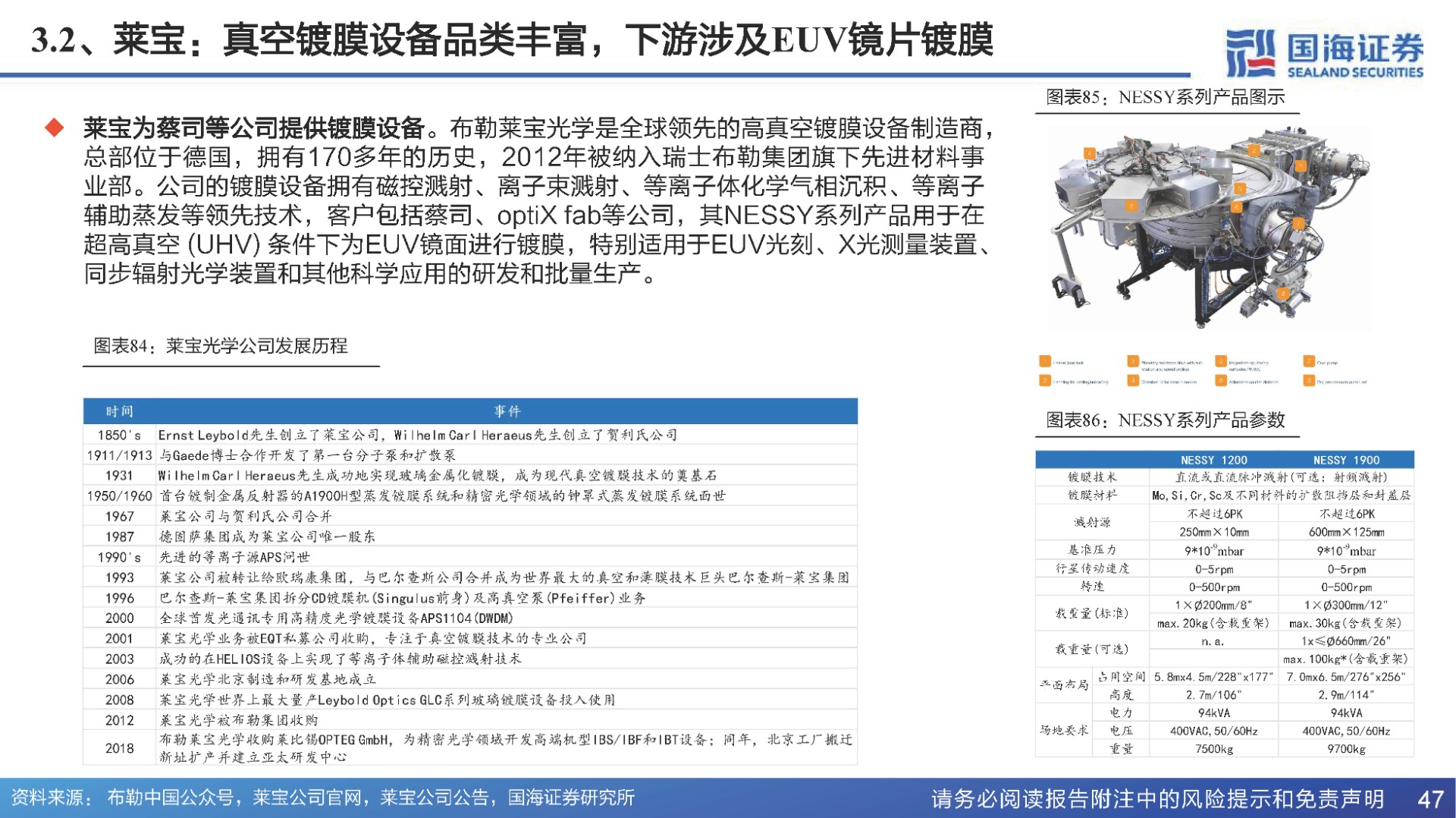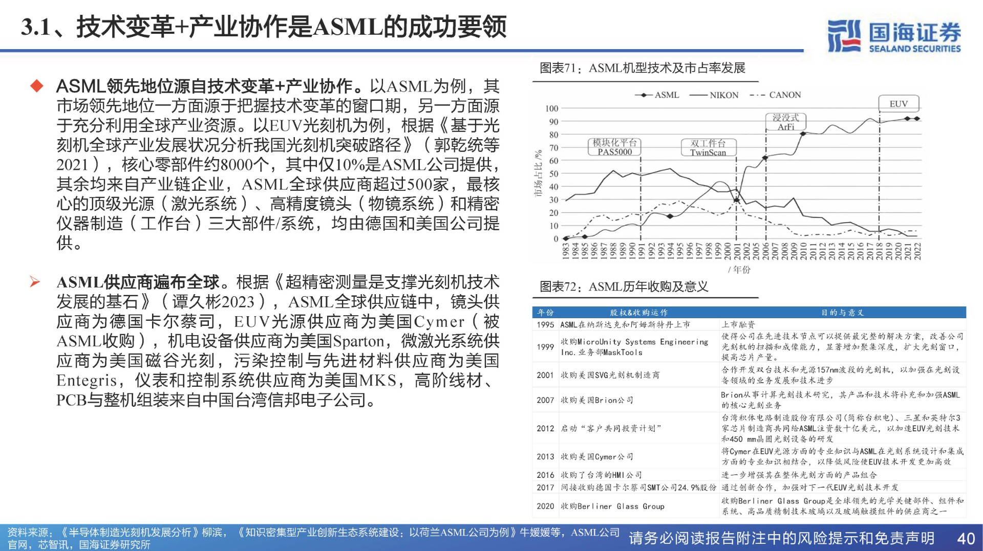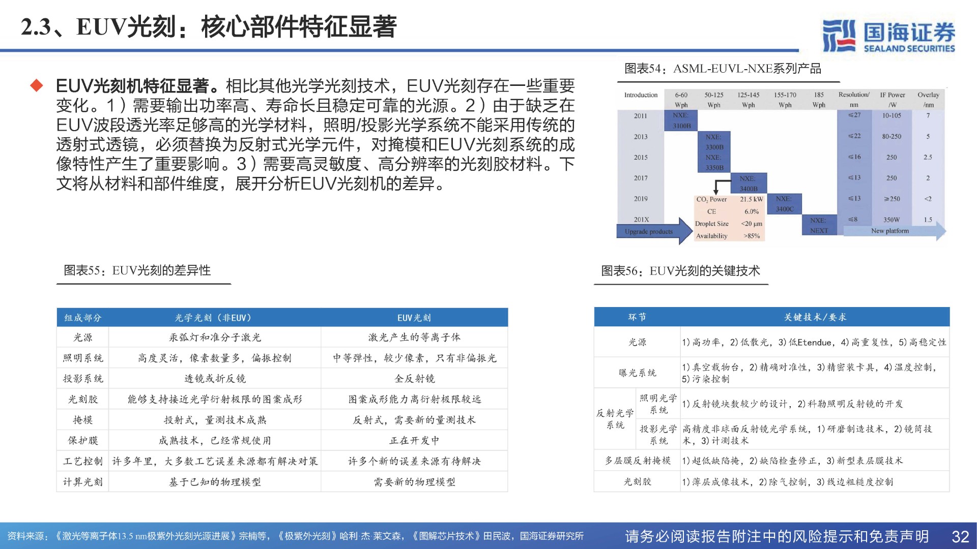 本篇报告解决了以下核心问题:1、光刻机核心部件的主要类型、基本原理、市场空间,EUV光刻机核心部件的差异性;2、ASML的产业协作 模式、核心部件主要供应商;3、光刻机国产化历程、现状,核心部件及加工
