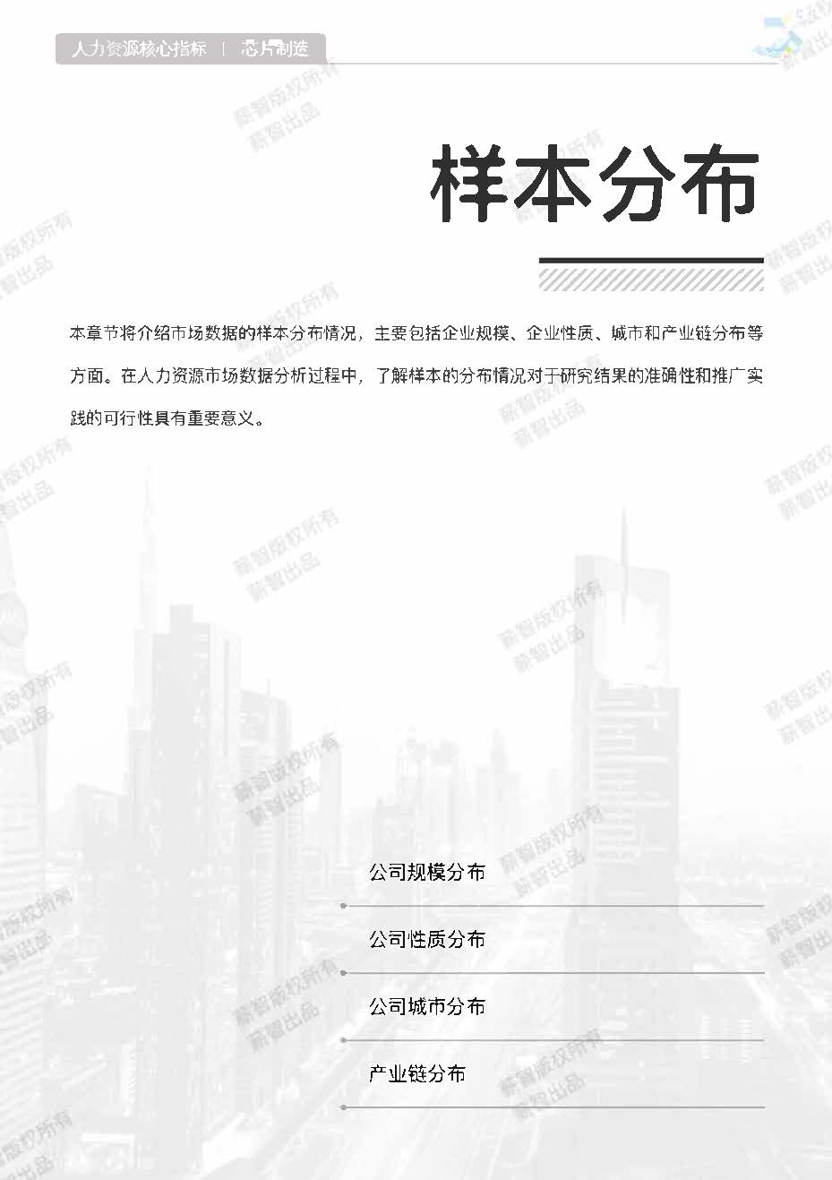 本窒节将介绍市场数据的样本分布情况, 主要包括企业规模、 企业性质 、 城市和产业链分布等方面。 在人力资源市场数据分析过程中, 了解样本的分布情况对于研究结果的准确性和推广实践的可行性具有重要意义。