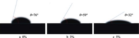 结合剂与金刚石之间的界面润湿性是衡量砂轮微观性能的重要指标,良好的界面润湿性可以有效提高结合剂对金刚石的把持力。Chen 等[43]将 V2O5 作为表面活性剂添加到陶瓷结合剂中,探究了它对陶瓷结合剂润湿性的影响。金刚石表面的不饱和碳原子与界面上的钒离子会在烧结过程中结合,形成 V—C 化学键,能有效降低界面张力,从而改善陶瓷结合剂与金刚石磨料的润湿性。V2O5 含量对陶瓷结合剂和金刚石磨料润湿性的影响如图 8 所示,可以看到 V2O5 的含量越高,结合剂的润湿性越好,金刚石颗粒被牢牢包裹在结合剂中。Chen 等[44]采用溶胶–凝胶法在金刚石表面制备了一层致密的 V2O5 薄膜,金刚石表面的不饱和碳原子与V2O5 薄膜结合,形成了O—V—C、 V—O—C 化学键。在烧结过程中,V2O5 薄膜会溶解在陶瓷结合剂中,这将降低陶瓷结合剂界面处的表面张力和耐火度,从而提高陶瓷结合剂与金刚石的润湿性。Guo 等[45]制备了不同含量 Li2O 的陶瓷结合剂,不同 Li2O 含量的陶瓷结合剂与金刚石膜之间的润湿图像如图 9 所示。随着 Li2O 含量的增加,结合剂熔体与磨料间的接触角逐渐减小,含有质量分数 5%的 Li2O 的陶瓷结合剂的接触角为 32°,结合剂对磨料具有较好的润湿性。这是由于 Li+存在于玻璃网络的间隙中, 其离子半径小,易于扩散移动,可以在带负电荷的金刚石磨料表面富集,降低金刚石的表面能,从而提高陶瓷结合剂对金刚石颗粒的润湿性。影响结合剂对金刚石颗粒润湿性的主要因素是结合剂的化学成分,通过向结合剂中添加相应的活性物质,从而改变结合剂界面的表面张力,降低金刚石的表面能,影响其接触角的大小,实现结合剂对金刚石的良好润湿,提高结合剂对磨粒的结合能力。