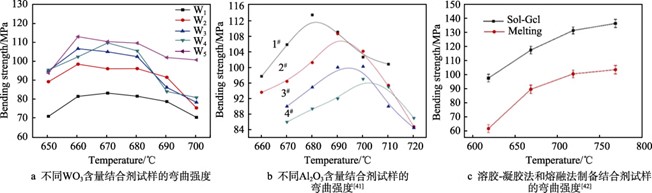 磨具的力学强度在很大程度上取决于结合剂的本征性能。为了提高磨具的力学强度,许多学者对陶瓷结合剂进行了改性。不同因素对结合剂强度的影响如图 7a、b 所示。Han 等[40]研究了不同含量 WO3 对 SiO2-B2O3-Al2O3-CaO 体系陶瓷结合剂结构和性能的影响。如图 7a 所示,在烧结温度低于 680 ℃时,结合剂的强度会随着 WO3 含量的增加而增大。这是由于 WO3 含量的增加会使[BO4]四面体减少,[BO3]三角体和 CaWO4 含量增加,而 W6+的电场强度高,能促进整体玻璃网络的聚集,其抗弯强度也随之增加,最大值达到 114 MPa。Shi 等[41]探究了不同含量的 Al2O3对陶瓷结合剂性能的影响。研究表明,在 SiO2-B2O3- Al2O3-CaO 系陶瓷结合剂中引入 Al2O3 能有效抑制结晶和相分离,增强结合剂玻璃网络的集聚作用,提高玻璃网络的整体强度。如图 7b 所示,随着 Al2O3 含量的增加,结合剂试样的强度随之降低,当 Al2O3 的质量分数为 5%(1#)时,陶瓷结合剂的力学性能最佳,其抗弯强度达到了 113 MPa。Zhang 等[42]对比研究了熔融法和溶胶–凝胶法制备 Na2O-Al2O3-B2O3-SiO2系陶瓷结合剂的性能差异,在不同温度下采用溶胶–凝胶法和熔融法制备的结合剂抗弯强度如图 7c 所示。采用熔融法制备的结合剂的抗弯强度最大值只有104 MPa,而采用溶胶–凝胶法制备的陶瓷结合剂由于含有较多的[AlO4]四面体基团,形成了致密的网状结构,具有更高的抗弯强度,最大值达到 137 MPa,同比增长了约 31.73%。通过制备工艺的优化和陶瓷结合剂体系配方的调控均可起到提高结合剂强度的作用,其本质是促进体系中网络结构的形成,增强玻璃网络的集聚作用。
